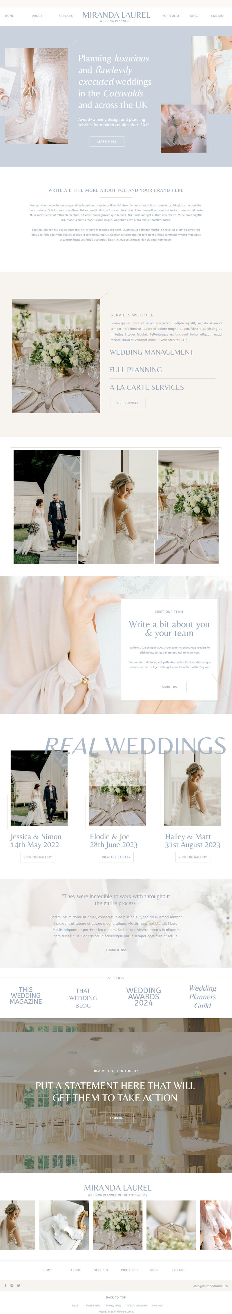 Laurel is a classic, elegant Showit website template with a modern twist. Clean lines, delicate details, and a high-end feel make it the perfect backdrop to show off your portfolio and services - and to guide dream couples from first click to “let’s book.”